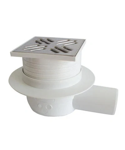 Podlahová výpusť s rozmermi 105×105 mm s bočným odpadom DN 50 mm.